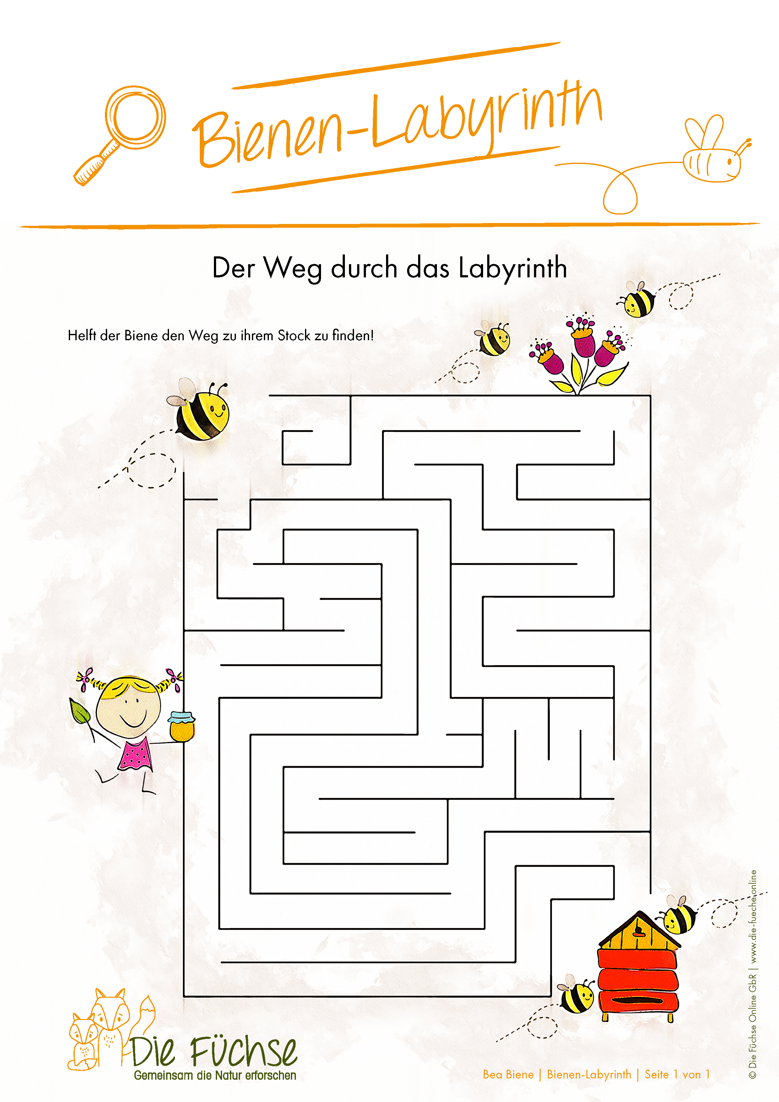 Zum Schluss gibt es noch ein Bienen-Labyrinth für euch, bei dem ihr den Weg zu unserem Bienenstock finden müsst.