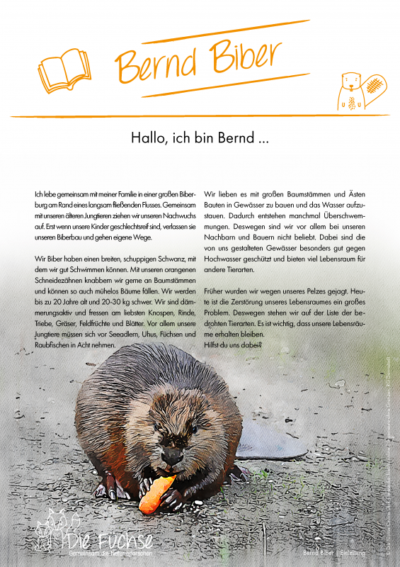 Hallo, ich bin Bernd! Ich lebe gemeinsam mit meiner Familie in einer großen Biberburg am Rand eines langsam fließenden Flusses. Gemeinsam mit unseren älteren Jungtieren ziehen wir unseren Nachwuchs auf. Erst wenn unsere Kinder geschlechtsreif sind, verlassen sie unseren Biberbau und gehen eigene Wege.